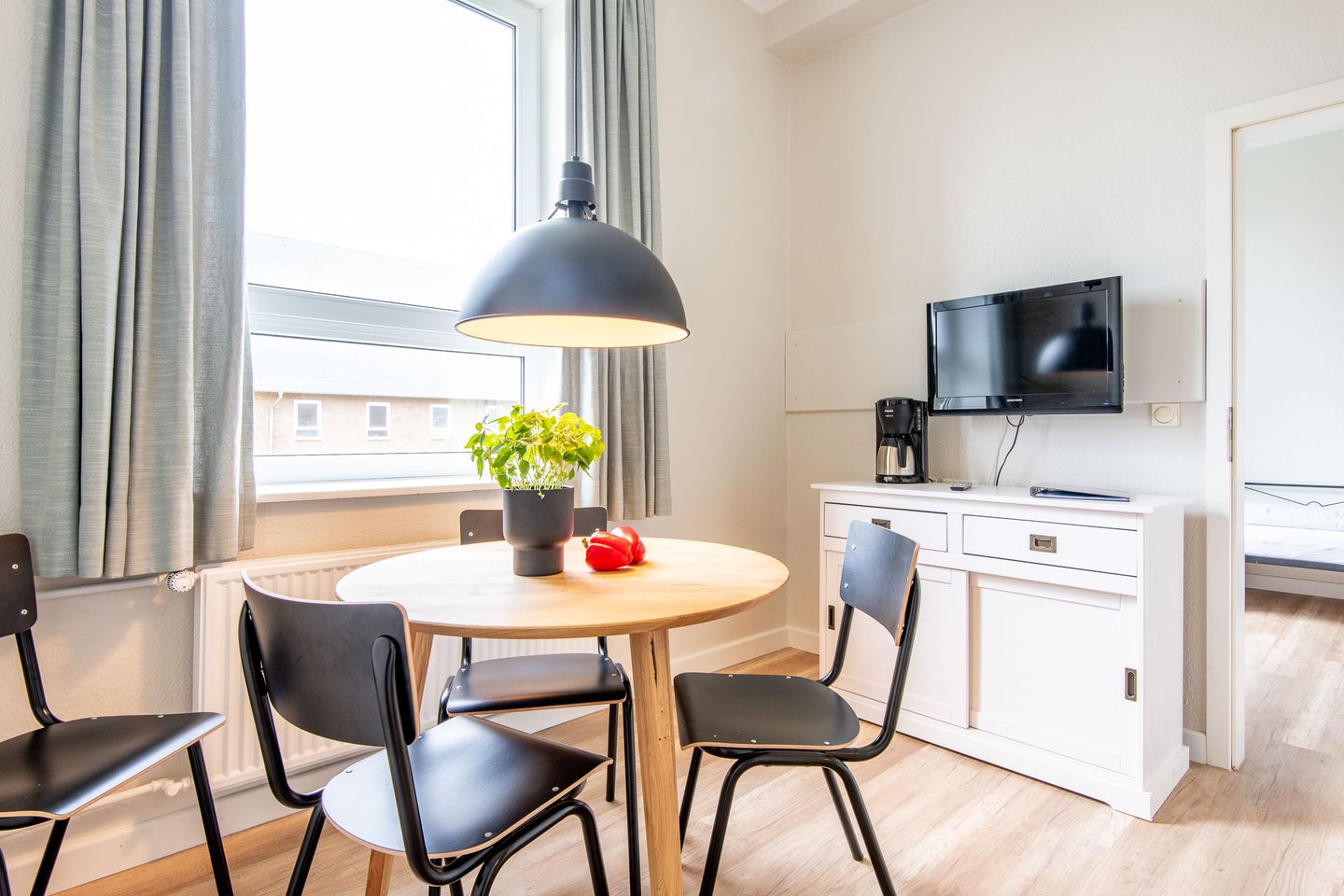 Der Wohn-Schlafbereich ist mit einer gemütlichen Sofaecke sowie einem TV-Gerät ausgestattet. Der Schlafbereich ist durch eine Wand vom Wohnbereich getrennt und mit einem bequemen Doppelbett und einem Kleiderschrank möbliert.